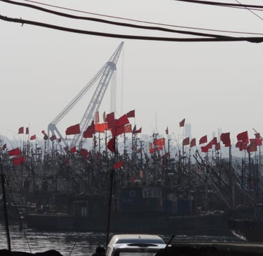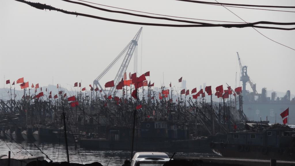 The Chinese flag is prominently displayed on small fishing boats along the harbour with shipbuilding cranes in the background