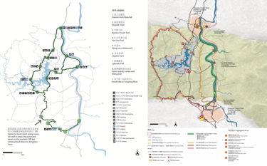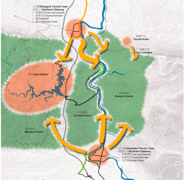 Armed with sufficient layers of information and analysis work, we proceeded to construct a regional conceptual framework plan, which divided the area up into three tourist hubs and three distinctive forest areas. The two existing villages are positioned as gateways providing access into the forest areas and the central lake district.