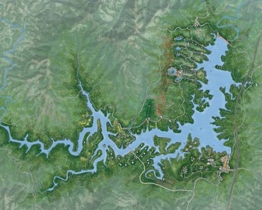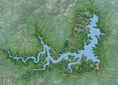 The development area is located south of the Yangtze River in a remote part of Sichuan. It took us about half a day to get there by plane from Shanghai and then a long car drive. With abundant natural resources and reasonably good access off a highway, the area is strategically positioned for tourism growth. The 70sqm study area is largely undeveloped with two small villages to the north and south of a man-made lake, which is nestled into surrounding undulating mountains and valleys. The objective of the regional government is to exploit the scenic beauty of the local landscape to stimulate the local economy through tourism development and activities. The engine of development growth will be the man-made lake at the heart of the area. The lake was formed after the construction of a dam in the area which safeguards the local water supply.