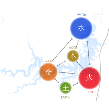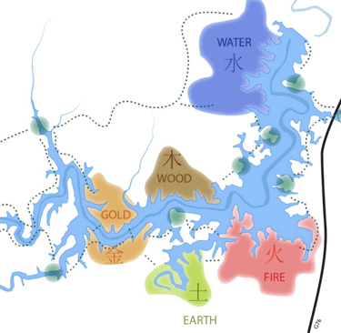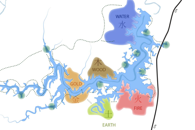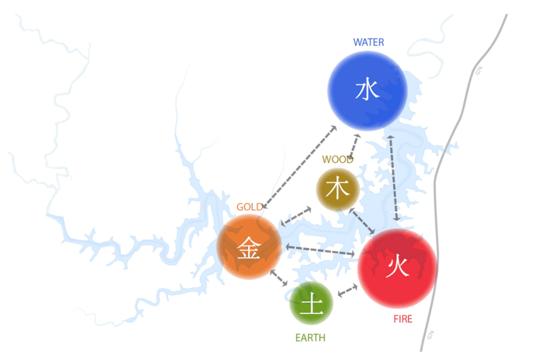 We took inspiration from the Chinese concept of the five elements that make up everything on earth - gold, wood, water, fire, earth. We conceived of five character areas drawing on the unique characteristics of each element matched to the potential of the local area. We felt the 5 elements theme tied to the specific and unique landscape of the area also had good branding potential in a highly competitive market, appealing to the local and national sentiment for symbolism as part of a landscape identity.
