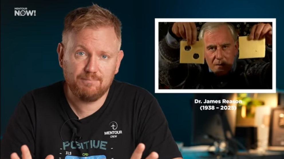 A screenshot from a "Mentor Pilot" youtube video where the pilot Petter Hörnfeldt is paying homage to the inventor of the swiss cheese model, Dr James Reason, who passed away in 2025
