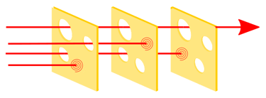 The Swiss Cheese model of accident causation likens human system defences to a series of slices of randomly-holed Swiss Cheese arranged vertically and parallel to each other with gaps in-between each slice. According to the swiss cheese model of safety, an accident happens when the holes in the stacked swiss cheese slices align, allowing a hazard to pass straight through unhindered. In the below diagram (from wikipedia), three hazard vectors are stopped by the defences, but one passes through where the "holes" are lined up.