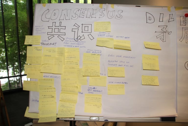 At the end of two day workshop, representatives from the community met with the towns promoters and municipal government to discuss the results and agree next steps. We documented these discussions, again bi-lingual, and prepared a report for the client to assist them with the next stage planning. For the next step it was agreed to re-visit the town’s residents charter and to form a committee with representatives from the town’s promoters (real estate developers), the residents and the municipal government to take forward the issues and suggestions to inform the next iteration of the town’s development plan. Given Liangzhu’s unique status as a privately developed town, one of the primary concerns of the residents was to seek clarity on the long term ownership and management of public infrastructure (roads, water, waste etc), which had up until recently, been managed privately, as well as the model for delivering new public facilities such as schools, public transport, etc.