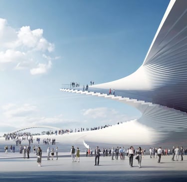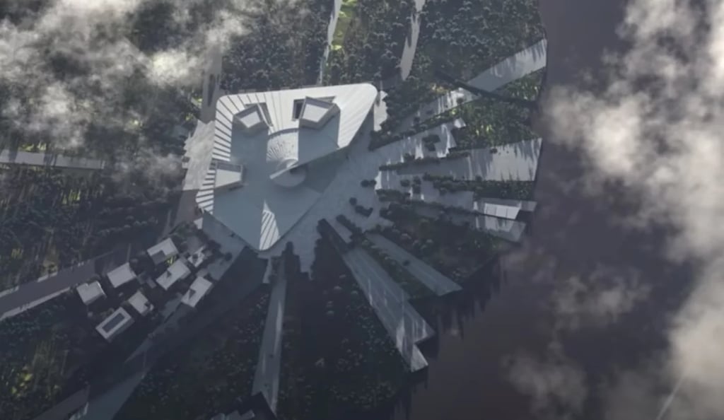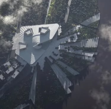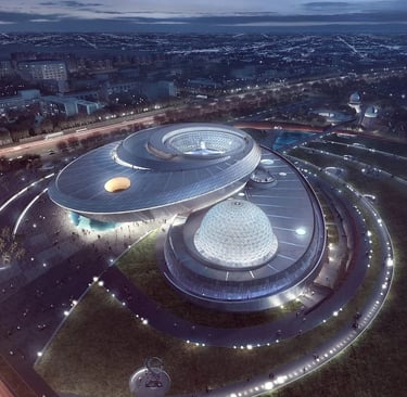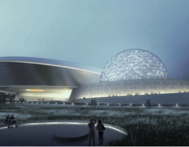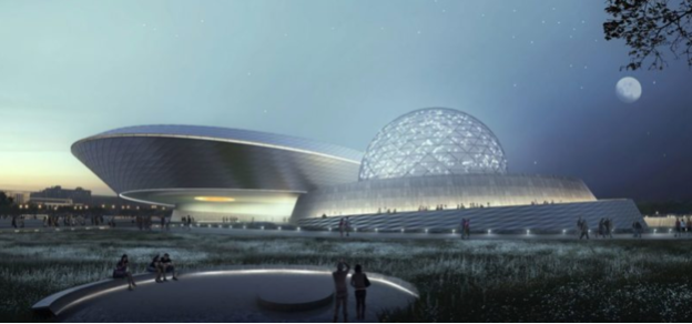 The swirling building design comprises three celestial inspired forms - the oculus, the inverted dome, and the sphere - set within a sunken plaza on one side and terraced landscape form on the other side park with pathways winding their way around the building. The interior comprises a central exhibition space, several observatories with telescopes that allow high-definition observation of the surface of the moon and planets, an education and research centre, an IMAX theatre. Temporary and permanent exhibition spaces are set to include interactive augmented and virtual reality activities powered by AI.