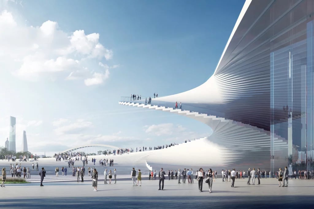 The striking building and surrounding open spaces resemble an unfolding fan, which is said to capture the “dynamism of dance and the human body.”