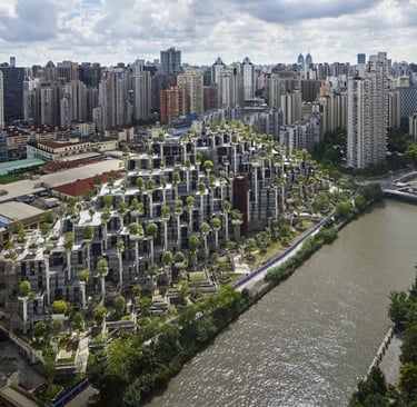 The skyline of Suzhou Creek is being transformed with this 300,000-square-meter mixed-use shopping complex, comprising a ‘mountain forests’, dubbed the city’s Hanging Gardens of Babylon.