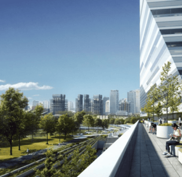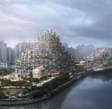 As its name states, the development imitates a hill-like topography with concrete structural columns that widen at the top to allow 1000 trees to be planted as hanging gardens. The development is sited along Moganshan and Changhua roads in Putuo District to the east of the Changhua Road Bridge close to the M50 arts district. British architects Heatherwick Studio imagined a green mountain in a relatively dense but flat city.