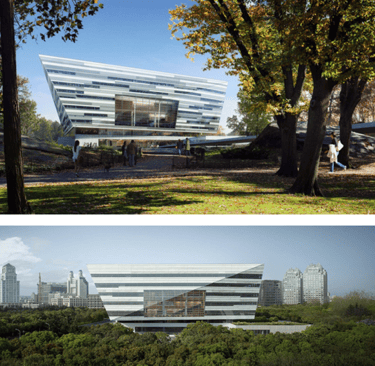 This new gigantic 115,000 m² library will compliment the museum and reinforce Century Park as a major cultural destination. According to the architects the building is conceived as a singular monolithic object floating above the tree canopy within the park. The main library volume floats above two pavilions that will house a 1200 seat performance venue, exhibition and events space and a dedicated children’s library, that will all open up towards a series of landscaped courtyards and gardens.